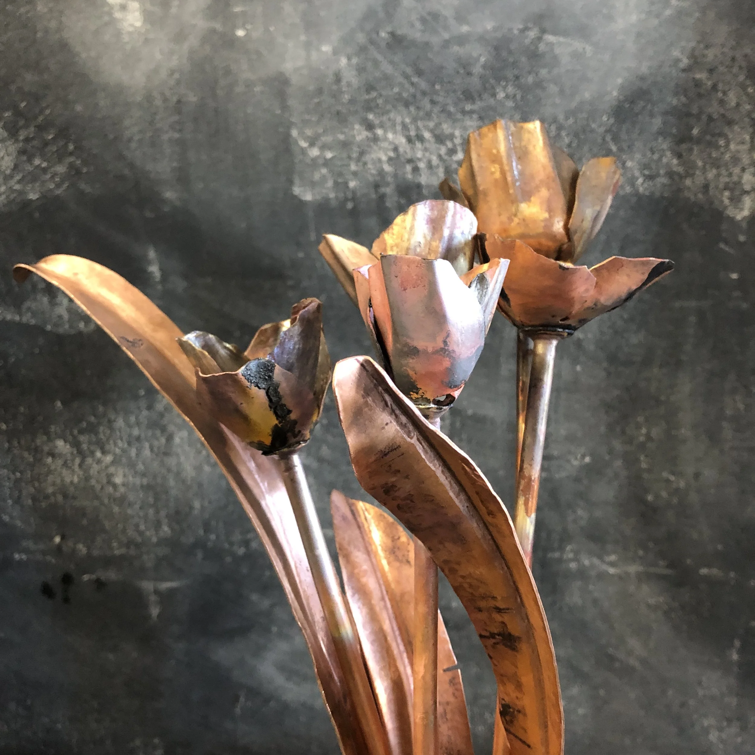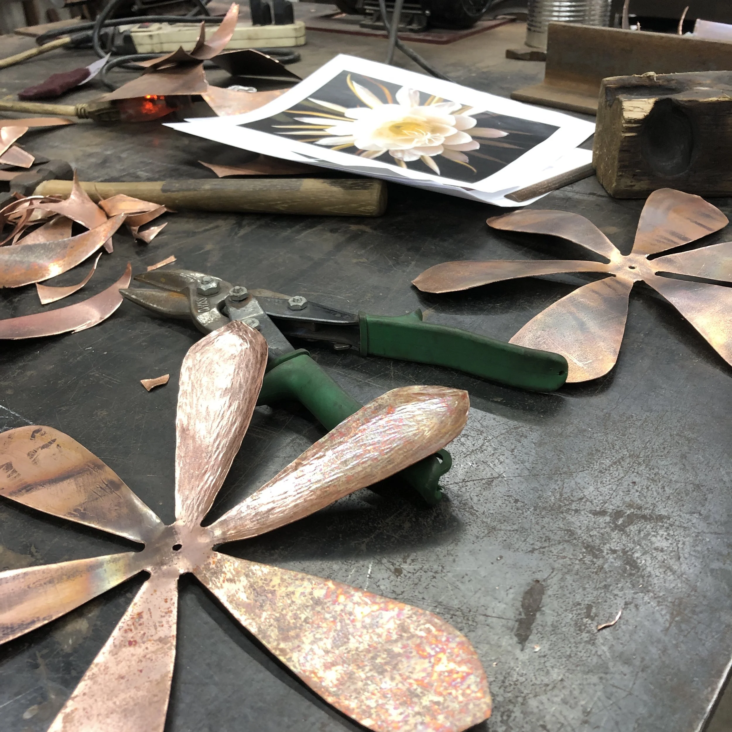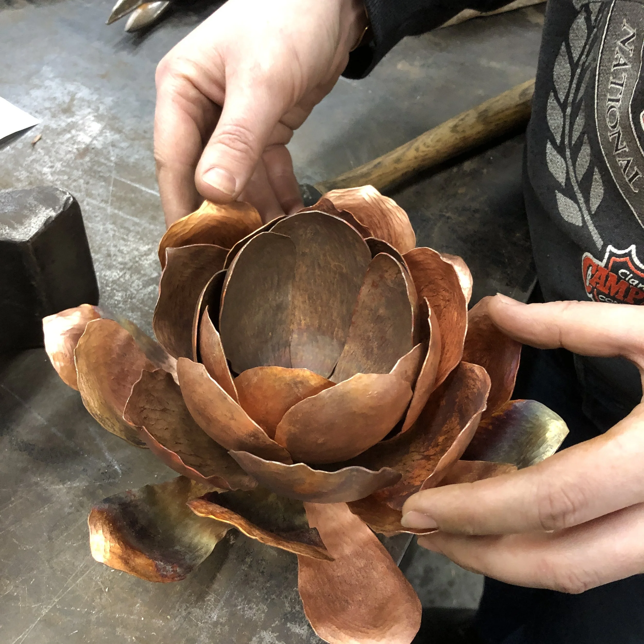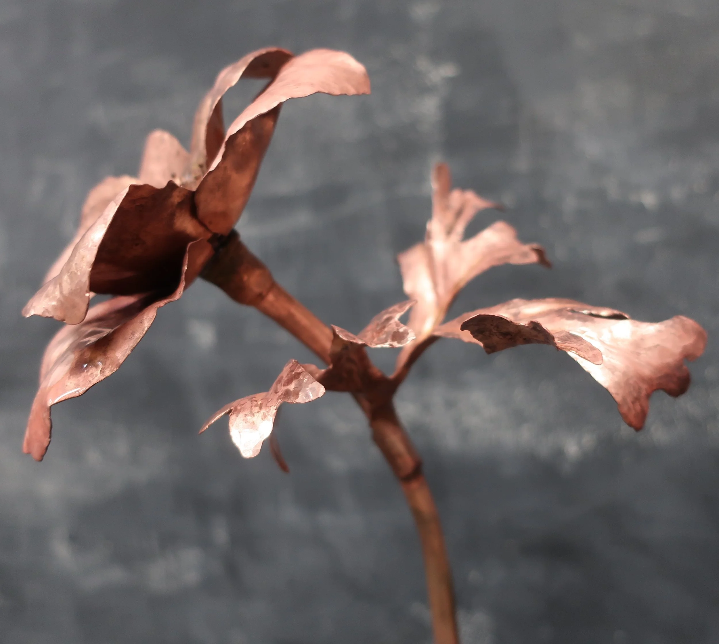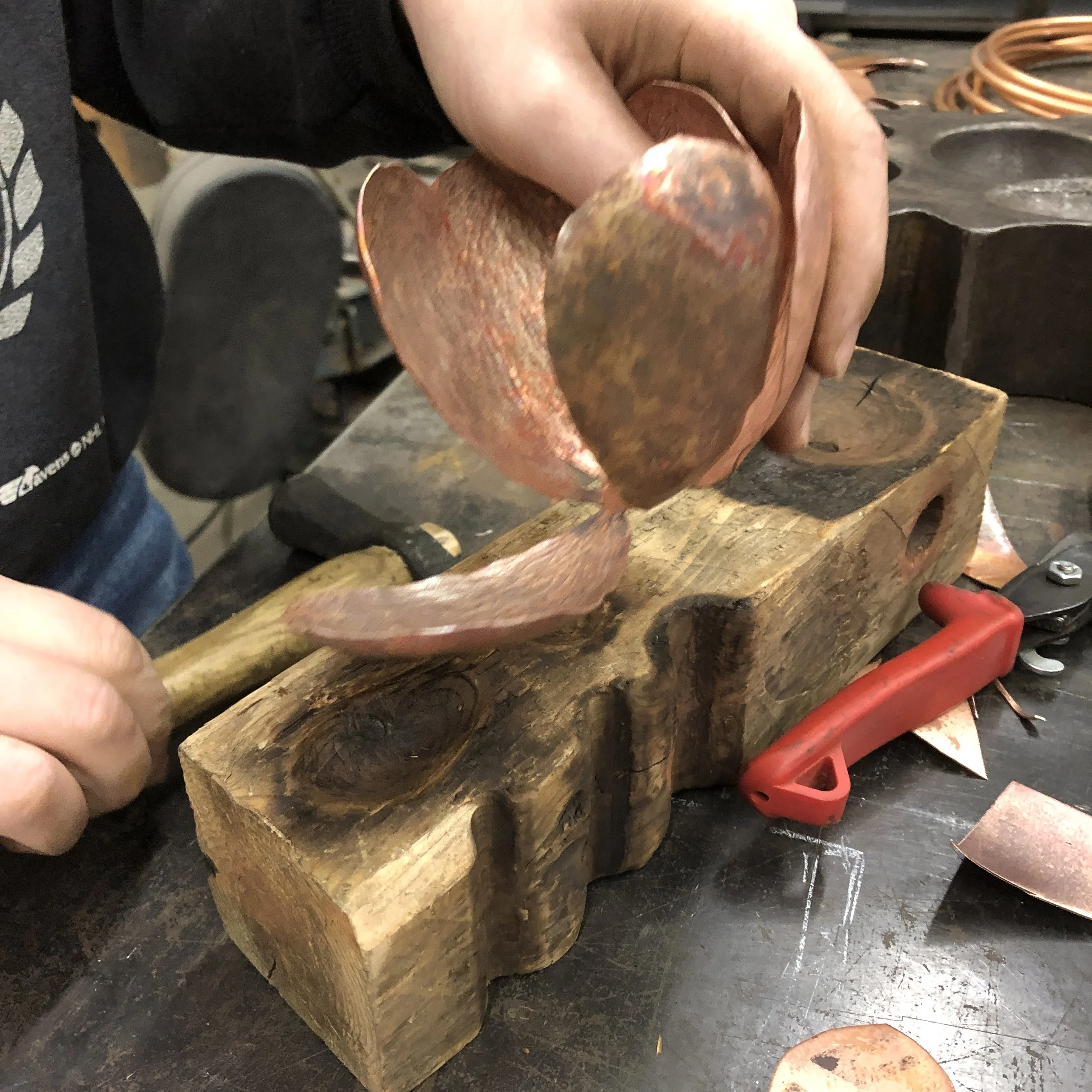 This introductory workshop focuses on creating natural plant forms using a variety of copper forming and joinery techniques: fold forming, forging, hollowing, raising, fullering, veining, soldering, drilling and tapping.