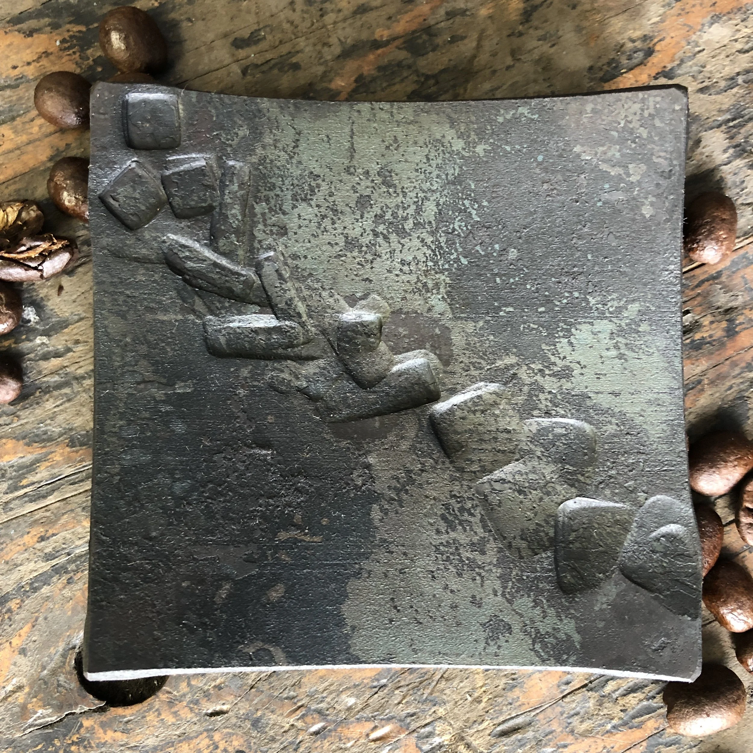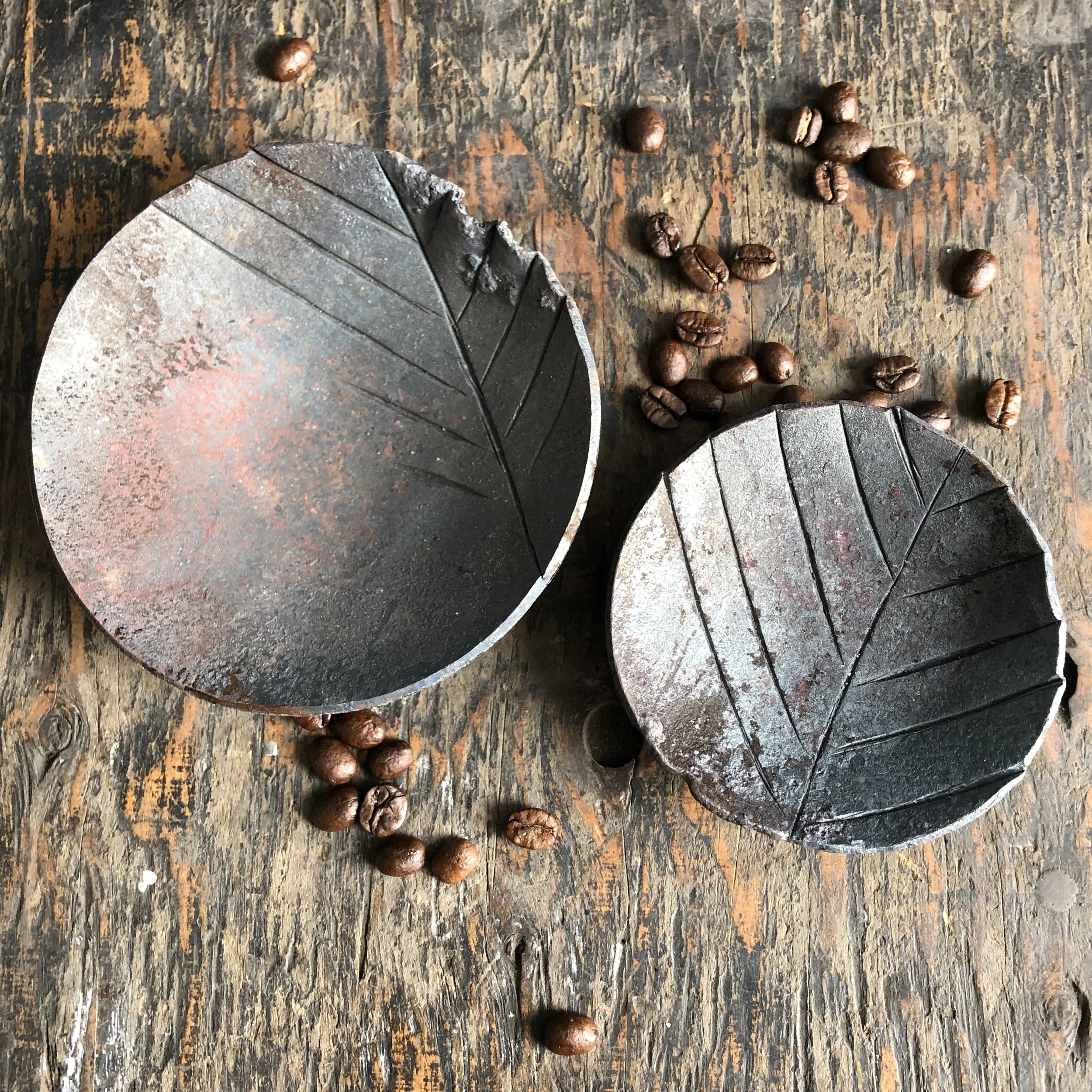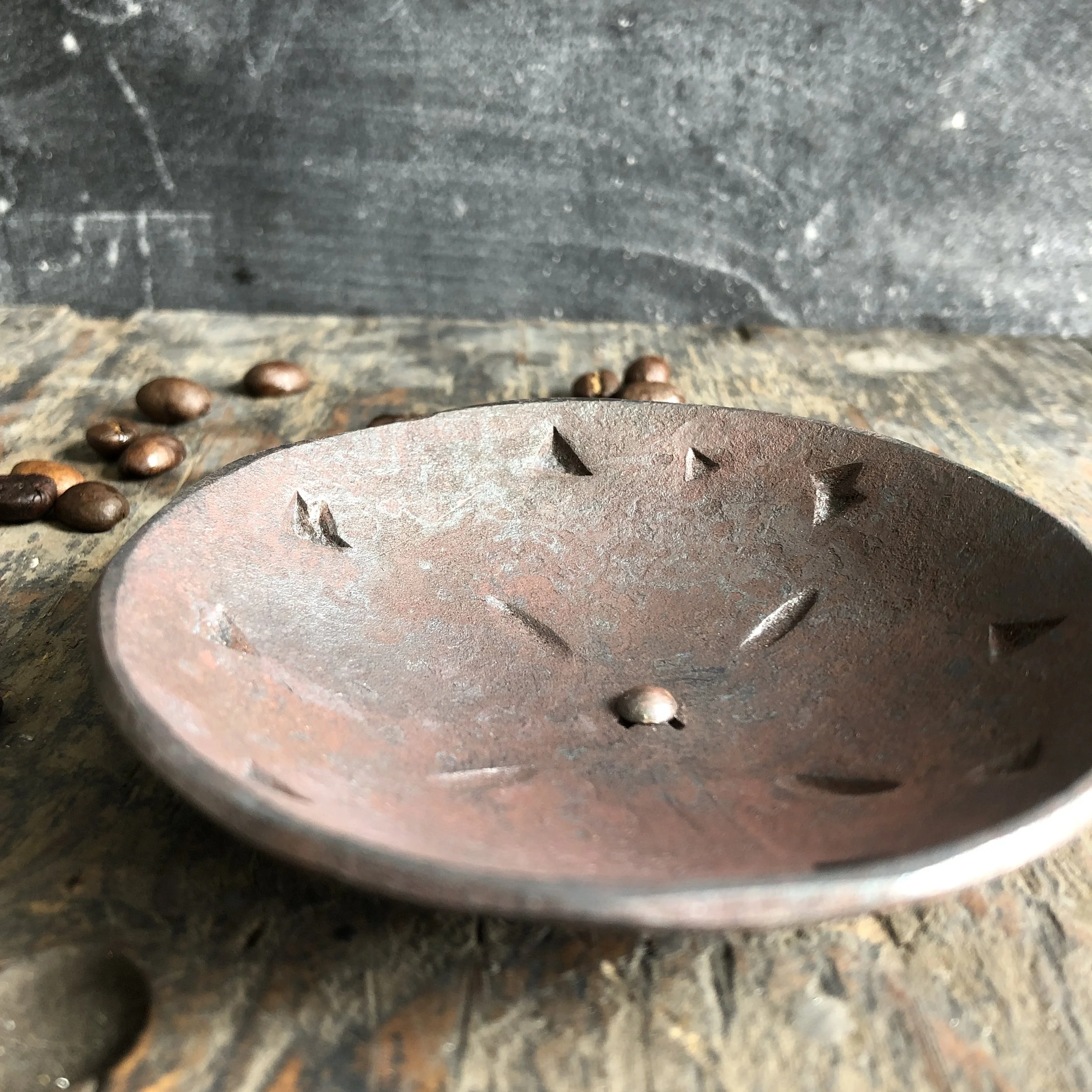 This introductory one day workshop explores creating texture in hot steel. We provide a set of steel discs, squares and or rectangles. You experiment with hammering textures into the surfaces and then form the flat pieces into small sauce dipping ramekins and serving plates.